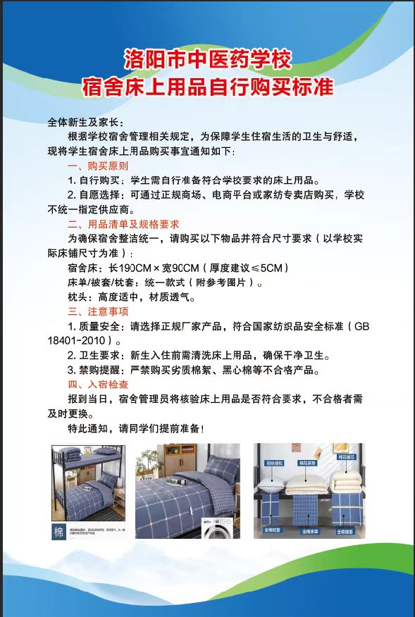 洛陽市中醫(yī)藥學(xué)校床上用品自行購買標準